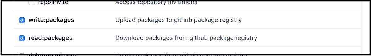 • Make sure you lot select the following scopes (" write:packages", " read:packages") and Generate a token
